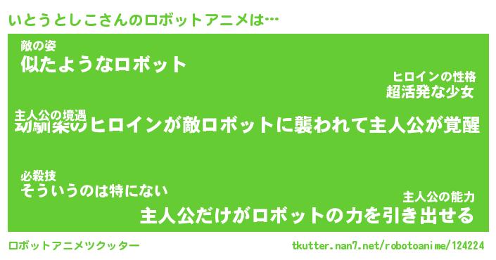 いとうとしこさんのロボットアニメは… 主人公の境遇『幼馴染のヒロインが敵ロボットに襲われて主人公が覚醒』敵の姿『似たようなロボット』主人公の能力『主人公だけがロボットの力を引き出せる』 ツクッター #ロボットアニメツクッター http://tkutter.nan7.net/robotoanime/124224/