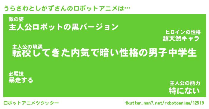 うらさわとしかずさんのロボットアニメは… 主人公の境遇『転校してきた内気で暗い性格の男子中学生』敵の姿『主人公ロボットの黒バージョン』主人公の能力『特にない』 ツクッター #ロボットアニメツクッター http://tkutter.nan7.net/robotoanime/12519/