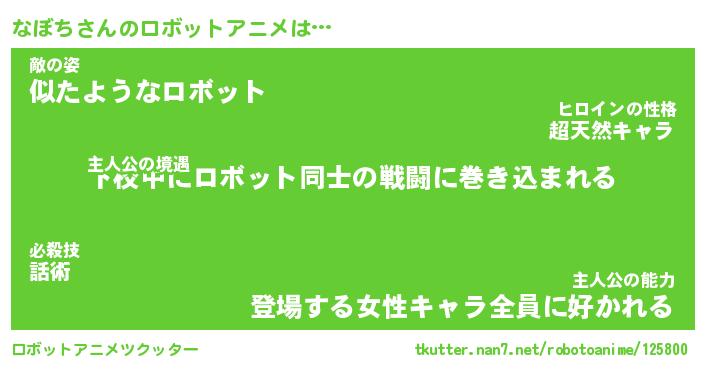 なぼちさんのロボットアニメは… 主人公の境遇『下校中にロボット同士の戦闘に巻き込まれる』敵の姿『似たようなロボット』主人公の能力『登場する女性キャラ全員に好かれる』 ツクッター #ロボットアニメツクッター http://tkutter.nan7.net/robotoanime/125800/