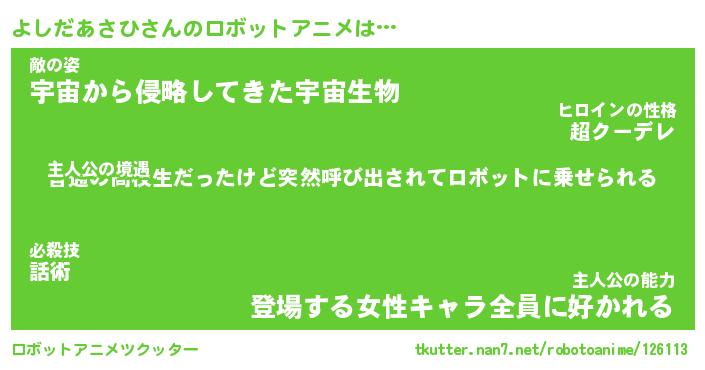 よしだあさひさんのロボットアニメは… 主人公の境遇『普通の高校生だったけど突然呼び出されてロボットに乗せられる』敵の姿『宇宙から侵略してきた宇宙生物』主人公の能力『登場する女性キャラ全員に好かれる』 ツクッター #ロボットアニメツクッター http://tkutter.nan7.net/robotoanime/126113/