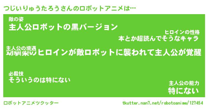 つじいりゅうたろうさんのロボットアニメは… 主人公の境遇『幼馴染のヒロインが敵ロボットに襲われて主人公が覚醒』敵の姿『主人公ロボットの黒バージョン』主人公の能力『特にない』 ツクッター #ロボットアニメツクッター http://tkutter.nan7.net/robotoanime/127454/