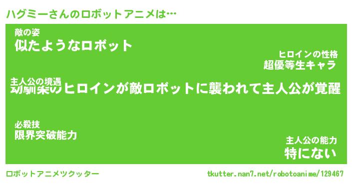 ハグミーさんのロボットアニメは… 主人公の境遇『幼馴染のヒロインが敵ロボットに襲われて主人公が覚醒』敵の姿『似たようなロボット』主人公の能力『特にない』 ツクッター #ロボットアニメツクッター http://tkutter.nan7.net/robotoanime/129467/