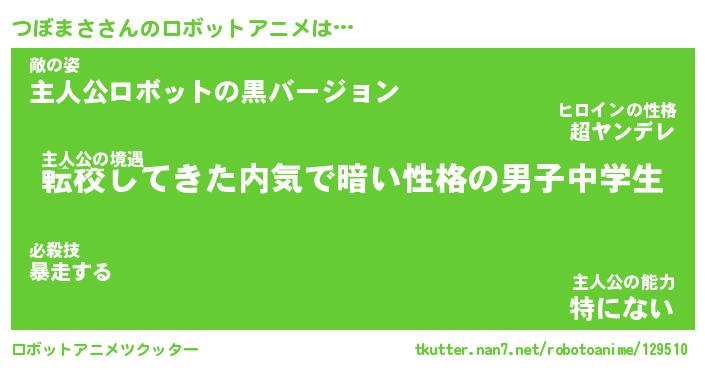 つぼまささんのロボットアニメは… 主人公の境遇『転校してきた内気で暗い性格の男子中学生』敵の姿『主人公ロボットの黒バージョン』主人公の能力『特にない』 ツクッター #ロボットアニメツクッター http://tkutter.nan7.net/robotoanime/129510/