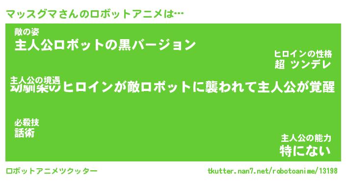マッスグマさんのロボットアニメは… 主人公の境遇『幼馴染のヒロインが敵ロボットに襲われて主人公が覚醒』敵の姿『主人公ロボットの黒バージョン』主人公の能力『特にない』 ツクッター #ロボットアニメツクッター http://tkutter.nan7.net/robotoanime/13198/