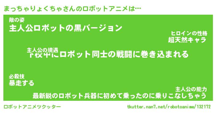 まっちゃりょくちゃさんのロボットアニメは… 主人公の境遇『下校中にロボット同士の戦闘に巻き込まれる』敵の姿『主人公ロボットの黒バージョン』主人公の能力『最新鋭のロボット兵器に初めて乗ったのに乗りこなしちゃう』 ツクッター #ロボットアニメツクッター http://tkutter.nan7.net/robotoanime/132172/
