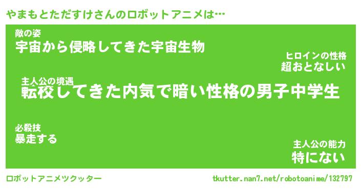 やまもとただすけさんのロボットアニメは… 主人公の境遇『転校してきた内気で暗い性格の男子中学生』敵の姿『宇宙から侵略してきた宇宙生物』主人公の能力『特にない』 ツクッター #ロボットアニメツクッター http://tkutter.nan7.net/robotoanime/132797/