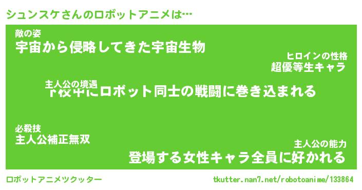 シュンスケさんのロボットアニメは… 主人公の境遇『下校中にロボット同士の戦闘に巻き込まれる』敵の姿『宇宙から侵略してきた宇宙生物』主人公の能力『登場する女性キャラ全員に好かれる』 ツクッター #ロボットアニメツクッター http://tkutter.nan7.net/robotoanime/133864/