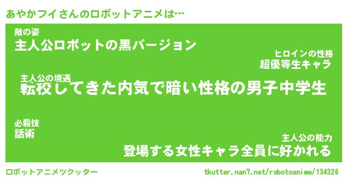 あやかフイさんのロボットアニメは… 主人公の境遇『転校してきた内気で暗い性格の男子中学生』敵の姿『主人公ロボットの黒バージョン』主人公の能力『登場する女性キャラ全員に好かれる』 ツクッター #ロボットアニメツクッター http://tkutter.nan7.net/robotoanime/134326/