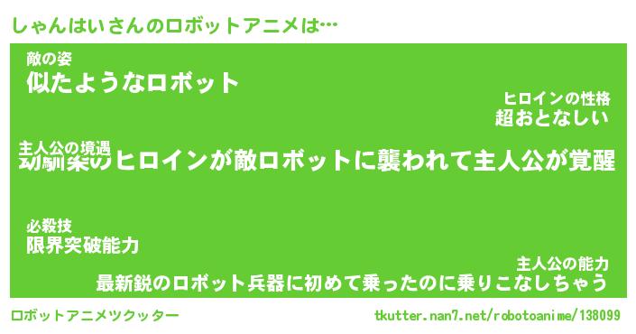 しゃんはいさんのロボットアニメは… 主人公の境遇『幼馴染のヒロインが敵ロボットに襲われて主人公が覚醒』敵の姿『似たようなロボット』主人公の能力『最新鋭のロボット兵器に初めて乗ったのに乗りこなしちゃう』 ツクッター #ロボットアニメツクッター http://tkutter.nan7.net/robotoanime/138099/