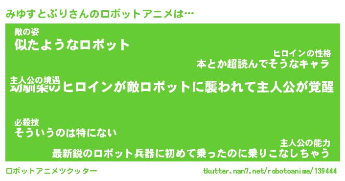 みゆすとぷりさんのロボットアニメは… 主人公の境遇『幼馴染のヒロインが敵ロボットに襲われて主人公が覚醒』敵の姿『似たようなロボット』主人公の能力『最新鋭のロボット兵器に初めて乗ったのに乗りこなしちゃう』 ツクッター #ロボットアニメツクッター http://tkutter.nan7.net/robotoanime/139444/