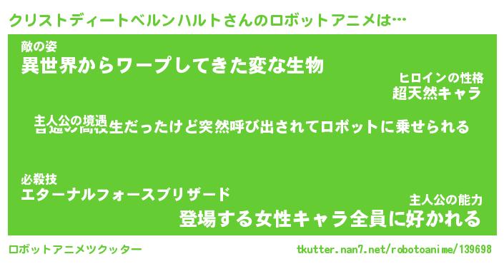 クリストディートベルンハルトさんのロボットアニメは… 主人公の境遇『普通の高校生だったけど突然呼び出されてロボットに乗せられる』敵の姿『異世界からワープしてきた変な生物』主人公の能力『登場する女性キャラ全員に好かれる』 ツクッター #ロボットアニメツクッター http://tkutter.nan7.net/robotoanime/139698/