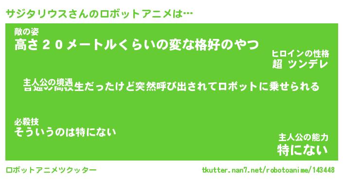 サジタリウスさんのロボットアニメは… 主人公の境遇『普通の高校生だったけど突然呼び出されてロボットに乗せられる』敵の姿『高さ20メートルくらいの変な格好のやつ』主人公の能力『特にない』 ツクッター #ロボットアニメツクッター http://tkutter.nan7.net/robotoanime/143448/