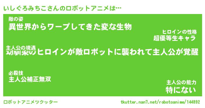 いしぐろみちこさんのロボットアニメは… 主人公の境遇『幼馴染のヒロインが敵ロボットに襲われて主人公が覚醒』敵の姿『異世界からワープしてきた変な生物』主人公の能力『特にない』 ツクッター #ロボットアニメツクッター http://tkutter.nan7.net/robotoanime/144892/