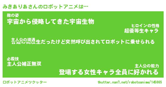 みきありあさんのロボットアニメは… 主人公の境遇『普通の高校生だったけど突然呼び出されてロボットに乗せられる』敵の姿『宇宙から侵略してきた宇宙生物』主人公の能力『登場する女性キャラ全員に好かれる』 ツクッター #ロボットアニメツクッター http://tkutter.nan7.net/robotoanime/145065/