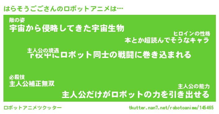 はらそうごごさんのロボットアニメは… 主人公の境遇『下校中にロボット同士の戦闘に巻き込まれる』敵の姿『宇宙から侵略してきた宇宙生物』主人公の能力『主人公だけがロボットの力を引き出せる』 ツクッター #ロボットアニメツクッター http://tkutter.nan7.net/robotoanime/145465/