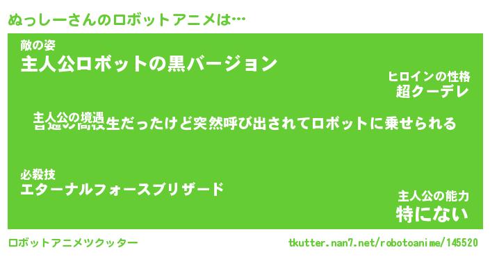 ぬっしーさんのロボットアニメは… 主人公の境遇『普通の高校生だったけど突然呼び出されてロボットに乗せられる』敵の姿『主人公ロボットの黒バージョン』主人公の能力『特にない』 ツクッター #ロボットアニメツクッター http://tkutter.nan7.net/robotoanime/145520/