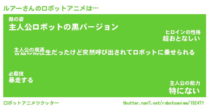 ルアーさんのロボットアニメは… 主人公の境遇『普通の高校生だったけど突然呼び出されてロボットに乗せられる』敵の姿『主人公ロボットの黒バージョン』主人公の能力『特にない』 ツクッター #ロボットアニメツクッター http://tkutter.nan7.net/robotoanime/152471/
