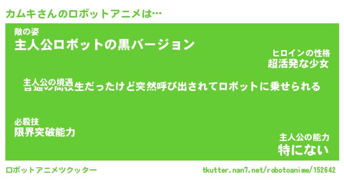カムキさんのロボットアニメは… 主人公の境遇『普通の高校生だったけど突然呼び出されてロボットに乗せられる』敵の姿『主人公ロボットの黒バージョン』主人公の能力『特にない』 ツクッター #ロボットアニメツクッター http://tkutter.nan7.net/robotoanime/152642/