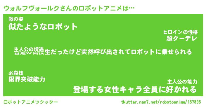 ウォルフヴォールクさんのロボットアニメは… 主人公の境遇『普通の高校生だったけど突然呼び出されてロボットに乗せられる』敵の姿『似たようなロボット』主人公の能力『登場する女性キャラ全員に好かれる』 ツクッター #ロボットアニメツクッター http://tkutter.nan7.net/robotoanime/157835/