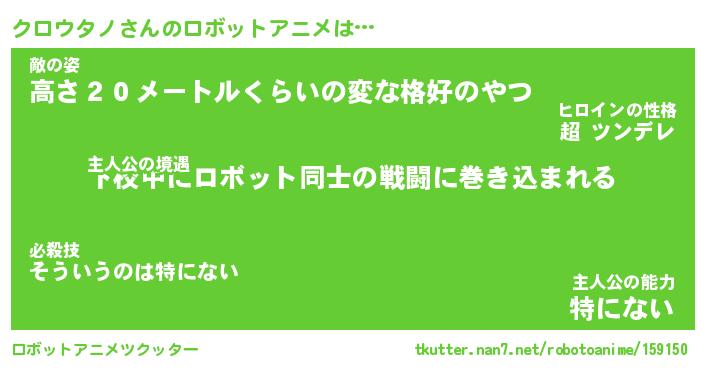 クロウタノさんのロボットアニメは… 主人公の境遇『下校中にロボット同士の戦闘に巻き込まれる』敵の姿『高さ20メートルくらいの変な格好のやつ』主人公の能力『特にない』 ツクッター #ロボットアニメツクッター http://tkutter.nan7.net/robotoanime/159150/