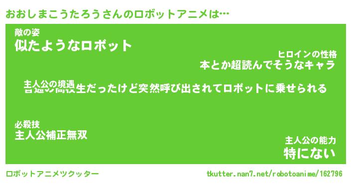 おおしまこうたろうさんのロボットアニメは… 主人公の境遇『普通の高校生だったけど突然呼び出されてロボットに乗せられる』敵の姿『似たようなロボット』主人公の能力『特にない』 ツクッター #ロボットアニメツクッター http://tkutter.nan7.net/robotoanime/162796/