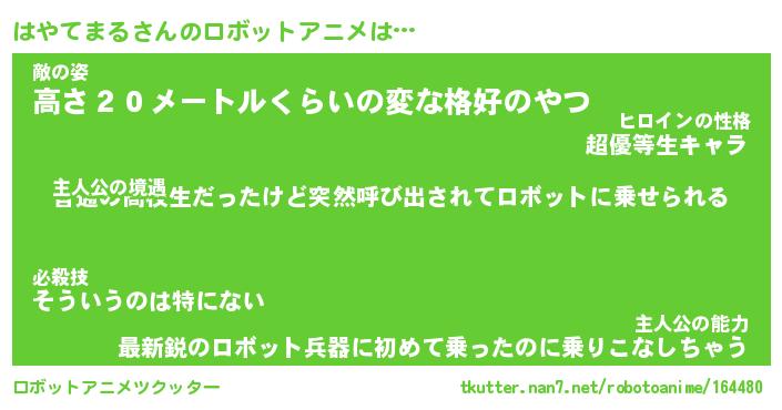 はやてまるさんのロボットアニメは… 主人公の境遇『普通の高校生だったけど突然呼び出されてロボットに乗せられる』敵の姿『高さ20メートルくらいの変な格好のやつ』主人公の能力『最新鋭のロボット兵器に初めて乗ったのに乗りこなしちゃう』 ツクッター #ロボットアニメツクッター http://tkutter.nan7.net/robotoanime/164480/