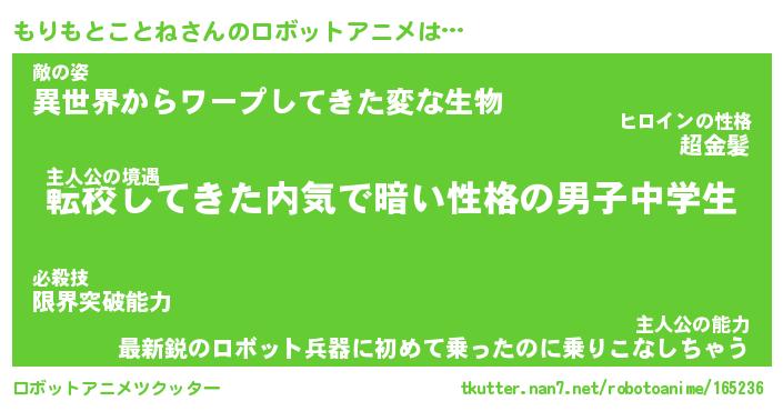 もりもとことねさんのロボットアニメは… 主人公の境遇『転校してきた内気で暗い性格の男子中学生』敵の姿『異世界からワープしてきた変な生物』主人公の能力『最新鋭のロボット兵器に初めて乗ったのに乗りこなしちゃう』 ツクッター #ロボットアニメツクッター http://tkutter.nan7.net/robotoanime/165236/