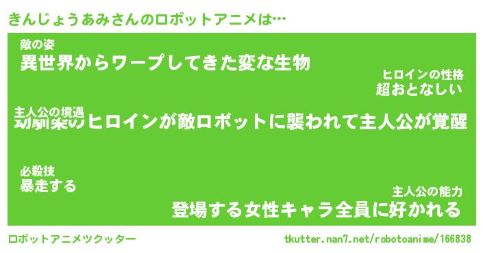 きんじょうあみさんのロボットアニメは… 主人公の境遇『幼馴染のヒロインが敵ロボットに襲われて主人公が覚醒』敵の姿『異世界からワープしてきた変な生物』主人公の能力『登場する女性キャラ全員に好かれる』 ツクッター #ロボットアニメツクッター http://tkutter.nan7.net/robotoanime/166838/