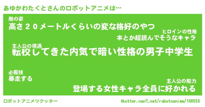あゆかわたくとさんのロボットアニメは… 主人公の境遇『転校してきた内気で暗い性格の男子中学生』敵の姿『高さ20メートルくらいの変な格好のやつ』主人公の能力『登場する女性キャラ全員に好かれる』 ツクッター #ロボットアニメツクッター http://tkutter.nan7.net/robotoanime/168555/