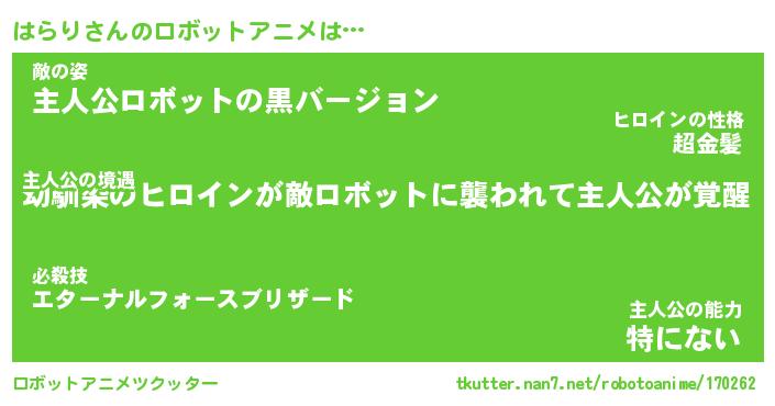 はらりさんのロボットアニメは… 主人公の境遇『幼馴染のヒロインが敵ロボットに襲われて主人公が覚醒』敵の姿『主人公ロボットの黒バージョン』主人公の能力『特にない』 ツクッター #ロボットアニメツクッター http://tkutter.nan7.net/robotoanime/170262/