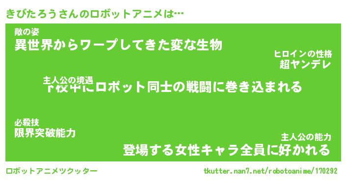 きびたろうさんのロボットアニメは… 主人公の境遇『下校中にロボット同士の戦闘に巻き込まれる』敵の姿『異世界からワープしてきた変な生物』主人公の能力『登場する女性キャラ全員に好かれる』 ツクッター #ロボットアニメツクッター http://tkutter.nan7.net/robotoanime/170292/