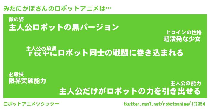 みたにかほさんのロボットアニメは… 主人公の境遇『下校中にロボット同士の戦闘に巻き込まれる』敵の姿『主人公ロボットの黒バージョン』主人公の能力『主人公だけがロボットの力を引き出せる』 ツクッター #ロボットアニメツクッター http://tkutter.nan7.net/robotoanime/172354/