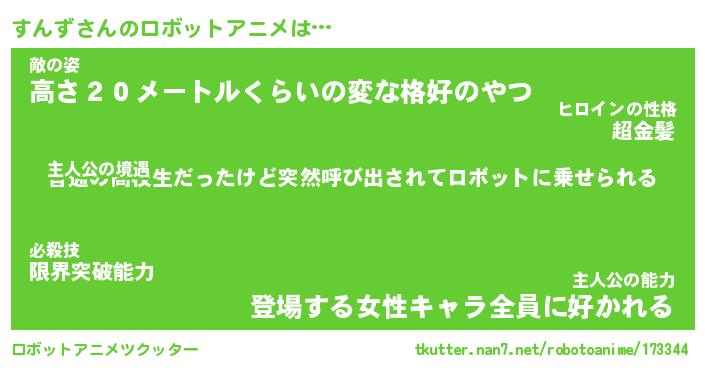 すんずさんのロボットアニメは… 主人公の境遇『普通の高校生だったけど突然呼び出されてロボットに乗せられる』敵の姿『高さ20メートルくらいの変な格好のやつ』主人公の能力『登場する女性キャラ全員に好かれる』 ツクッター #ロボットアニメツクッター http://tkutter.nan7.net/robotoanime/173344/