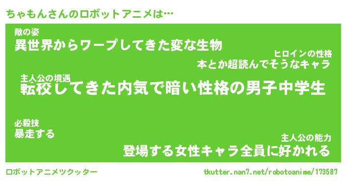 ちゃもんさんのロボットアニメは… 主人公の境遇『転校してきた内気で暗い性格の男子中学生』敵の姿『異世界からワープしてきた変な生物』主人公の能力『登場する女性キャラ全員に好かれる』 ツクッター #ロボットアニメツクッター http://tkutter.nan7.net/robotoanime/173587/