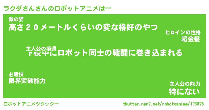 ラクダさんさんのロボットアニメは… 主人公の境遇『下校中にロボット同士の戦闘に巻き込まれる』敵の姿『高さ20メートルくらいの変な格好のやつ』主人公の能力『特にない』 ツクッター #ロボットアニメツクッター http://tkutter.nan7.net/robotoanime/173875/