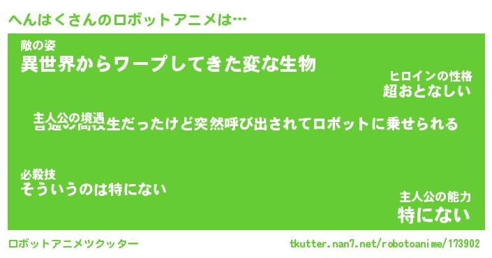 へんはくさんのロボットアニメは… 主人公の境遇『普通の高校生だったけど突然呼び出されてロボットに乗せられる』敵の姿『異世界からワープしてきた変な生物』主人公の能力『特にない』 ツクッター #ロボットアニメツクッター http://tkutter.nan7.net/robotoanime/173902/