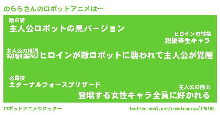 のららさんのロボットアニメは… 主人公の境遇『幼馴染のヒロインが敵ロボットに襲われて主人公が覚醒』敵の姿『主人公ロボットの黒バージョン』主人公の能力『登場する女性キャラ全員に好かれる』 ツクッター #ロボットアニメツクッター http://tkutter.nan7.net/robotoanime/176106/