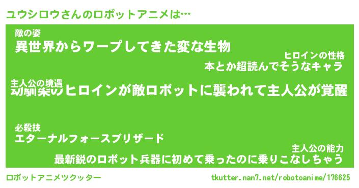 ユウシロウさんのロボットアニメは… 主人公の境遇『幼馴染のヒロインが敵ロボットに襲われて主人公が覚醒』敵の姿『異世界からワープしてきた変な生物』主人公の能力『最新鋭のロボット兵器に初めて乗ったのに乗りこなしちゃう』 ツクッター #ロボットアニメツクッター http://tkutter.nan7.net/robotoanime/176625/