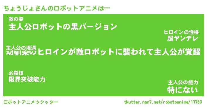 ちょうじょさんのロボットアニメは… 主人公の境遇『幼馴染のヒロインが敵ロボットに襲われて主人公が覚醒』敵の姿『主人公ロボットの黒バージョン』主人公の能力『特にない』 ツクッター #ロボットアニメツクッター http://tkutter.nan7.net/robotoanime/17763/