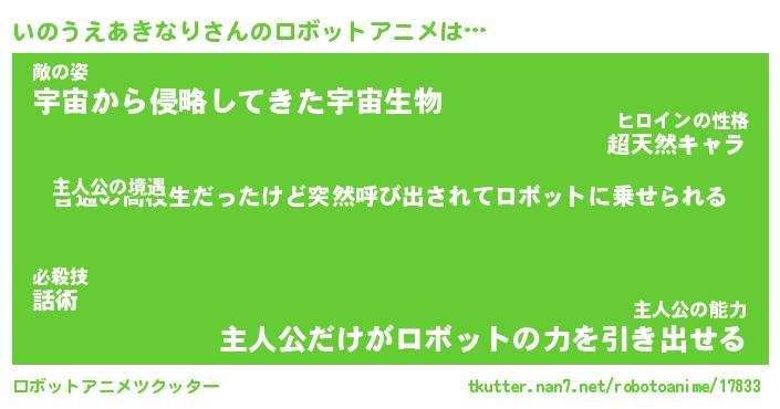 いのうえあきなりさんのロボットアニメは… 主人公の境遇『普通の高校生だったけど突然呼び出されてロボットに乗せられる』敵の姿『宇宙から侵略してきた宇宙生物』主人公の能力『主人公だけがロボットの力を引き出せる』 ツクッター #ロボットアニメツクッター http://tkutter.nan7.net/robotoanime/17833/