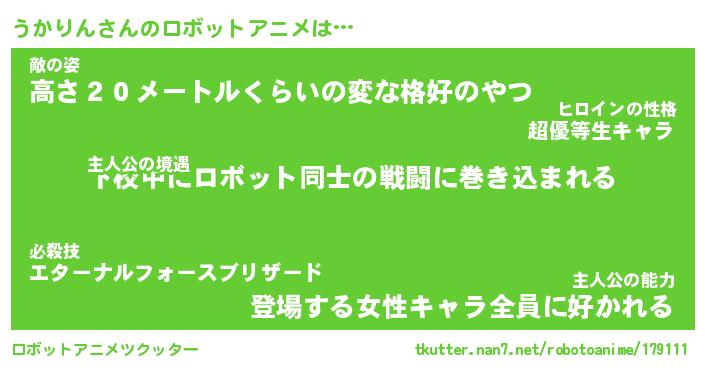 うかりんさんのロボットアニメは… 主人公の境遇『下校中にロボット同士の戦闘に巻き込まれる』敵の姿『高さ20メートルくらいの変な格好のやつ』主人公の能力『登場する女性キャラ全員に好かれる』 ツクッター #ロボットアニメツクッター http://tkutter.nan7.net/robotoanime/179111/