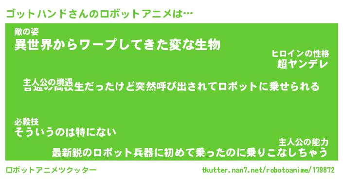 ゴットハンドさんのロボットアニメは… 主人公の境遇『普通の高校生だったけど突然呼び出されてロボットに乗せられる』敵の姿『異世界からワープしてきた変な生物』主人公の能力『最新鋭のロボット兵器に初めて乗ったのに乗りこなしちゃう』 ツクッター #ロボットアニメツクッター http://tkutter.nan7.net/robotoanime/179872/