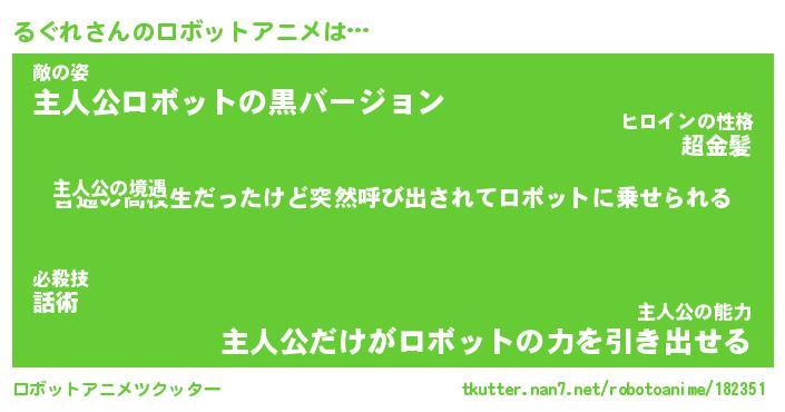 るぐれさんのロボットアニメは… 主人公の境遇『普通の高校生だったけど突然呼び出されてロボットに乗せられる』敵の姿『主人公ロボットの黒バージョン』主人公の能力『主人公だけがロボットの力を引き出せる』 ツクッター #ロボットアニメツクッター http://tkutter.nan7.net/robotoanime/182351/