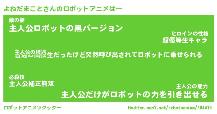 よねだまことさんのロボットアニメは… 主人公の境遇『普通の高校生だったけど突然呼び出されてロボットに乗せられる』敵の姿『主人公ロボットの黒バージョン』主人公の能力『主人公だけがロボットの力を引き出せる』 ツクッター #ロボットアニメツクッター http://tkutter.nan7.net/robotoanime/184413/