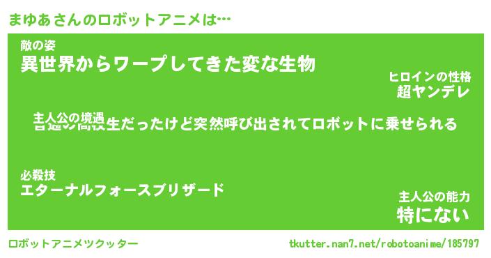 まゆあさんのロボットアニメは… 主人公の境遇『普通の高校生だったけど突然呼び出されてロボットに乗せられる』敵の姿『異世界からワープしてきた変な生物』主人公の能力『特にない』 ツクッター #ロボットアニメツクッター http://tkutter.nan7.net/robotoanime/185797/