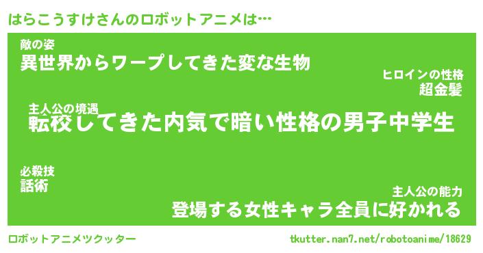 はらこうすけさんのロボットアニメは… 主人公の境遇『転校してきた内気で暗い性格の男子中学生』敵の姿『異世界からワープしてきた変な生物』主人公の能力『登場する女性キャラ全員に好かれる』 ツクッター #ロボットアニメツクッター http://tkutter.nan7.net/robotoanime/18629/