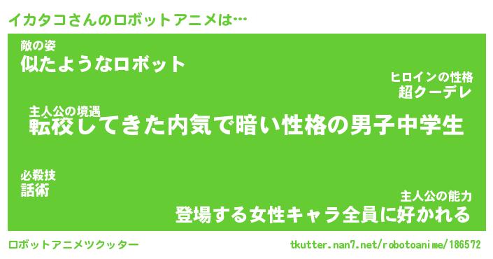イカタコさんのロボットアニメは… 主人公の境遇『転校してきた内気で暗い性格の男子中学生』敵の姿『似たようなロボット』主人公の能力『登場する女性キャラ全員に好かれる』 ツクッター #ロボットアニメツクッター http://tkutter.nan7.net/robotoanime/186572/
