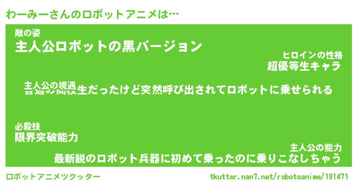 わーみーさんのロボットアニメは… 主人公の境遇『普通の高校生だったけど突然呼び出されてロボットに乗せられる』敵の姿『主人公ロボットの黒バージョン』主人公の能力『最新鋭のロボット兵器に初めて乗ったのに乗りこなしちゃう』 ツクッター #ロボットアニメツクッター http://tkutter.nan7.net/robotoanime/191471/