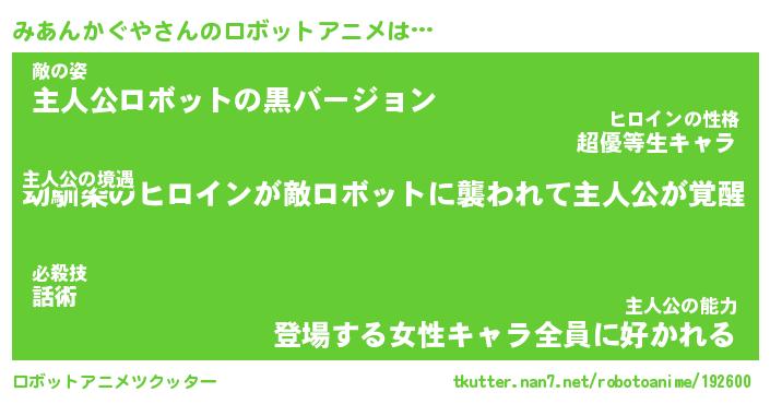 みあんかぐやさんのロボットアニメは… 主人公の境遇『幼馴染のヒロインが敵ロボットに襲われて主人公が覚醒』敵の姿『主人公ロボットの黒バージョン』主人公の能力『登場する女性キャラ全員に好かれる』 ツクッター #ロボットアニメツクッター http://tkutter.nan7.net/robotoanime/192600/