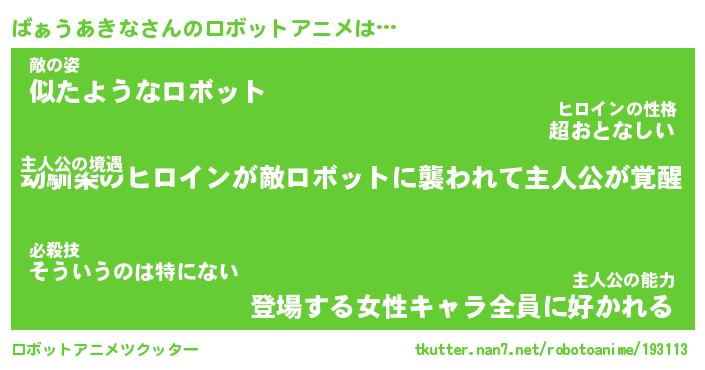 ばぁうあきなさんのロボットアニメは… 主人公の境遇『幼馴染のヒロインが敵ロボットに襲われて主人公が覚醒』敵の姿『似たようなロボット』主人公の能力『登場する女性キャラ全員に好かれる』 ツクッター #ロボットアニメツクッター http://tkutter.nan7.net/robotoanime/193113/
